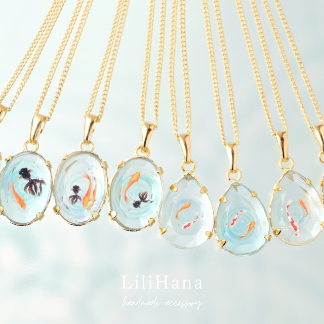 ※受注生産となります。お届けまで1~2週間頂戴いたします※ 蒸し暑さの中、海風に吹かれて歩く夏祭り。 小さな金魚たちを、ひと粒の宝石にそっと閉じ込めました 13mm×18mmの透明な宝石の中を、2匹の金魚がゆらり、ゆらゆらと泳ぎます。 涼やかな浅葱色の水面に浮かぶ、夢のような「ひとすくい」。 夏祭りの記憶を、そのまま宝石にしたかのような幻想的なネックレスです。 金魚の色合いや泳ぎ方は一点ずつ異なり、それぞれが小さな物語を宿しています。 アジャスターにも水のしずくがひとつ。水面のきらめきをそっと添えました。 浴衣やワンピースにも映える和の風情を、季節を問わず胸元に。 夏の涼を感じるアクセサリーとして、お楽しみください。 中に閉じ込めた《①水紋の大きさ》《②金魚の種類》《③金魚の泳ぎ方》には個体差があり、配置はすべて異なります。 どの子が届くか、楽しみにお待ちください。 《 宝石シリーズについて 》 石座に合わせたモールドを原型から自作し、一つひとつ丁寧にレジンで封入・貼り合わせて制作しています。 【サイズ・素材】 ・宝石パーツ:約13×18mm(オーバル型) ・チェーン:約45cm+アジャスター付 ・素材:レジン、合金メッキパーツ、チェコビーズ