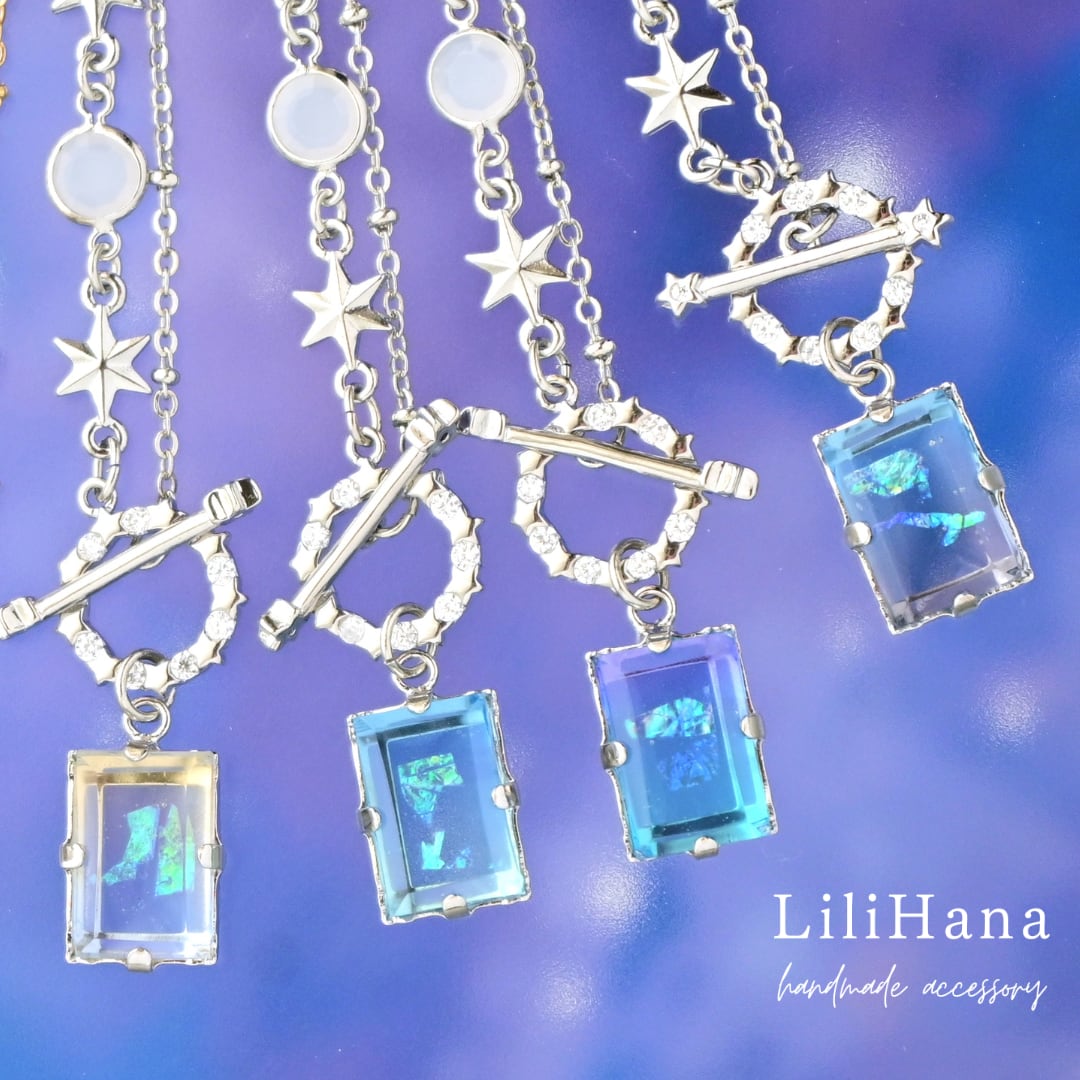 レクタングルの宝石は、特注の石座に合わせてモールドを原型から製作し、レジンで夜空を一つ一つ手作業で閉じ込めています