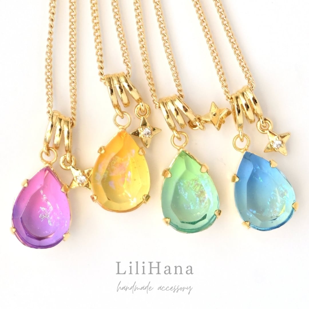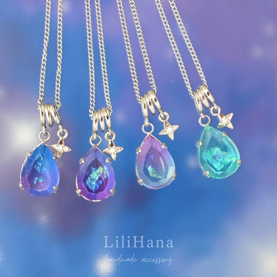 ドロップ型の宝石は、特注の石座に合わせてモールドを原型から製作し、レジンで夜空を一つ一つ手作業で貼り合わせながら閉じ込めています